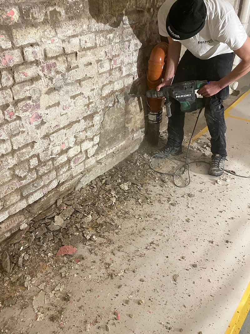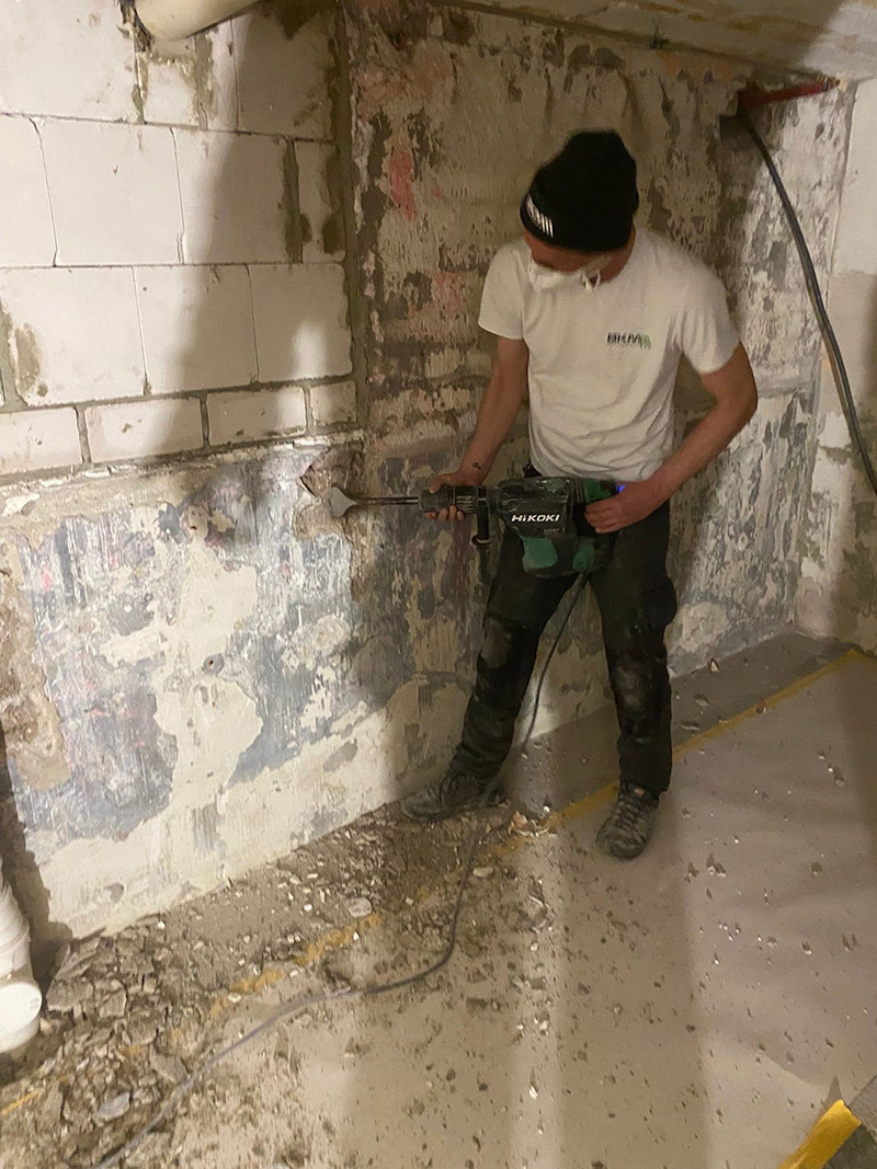 Zunächst wurden die nicht fachgerecht angebrachten Vorwandkonstruktionen sowie lose und geschädigte Putzbereiche vollständig entfernt. Anschließend wurden die Wandflächen gründlich gereinigt und für die Abdichtungsarbeiten vorbereitet. Im Wand-Sohlen-Bereich wurde zusätzlich eine Nut ausgestemmt, um eine sichere Verbindung der Abdichtungsebenen zu gewährleisten.
