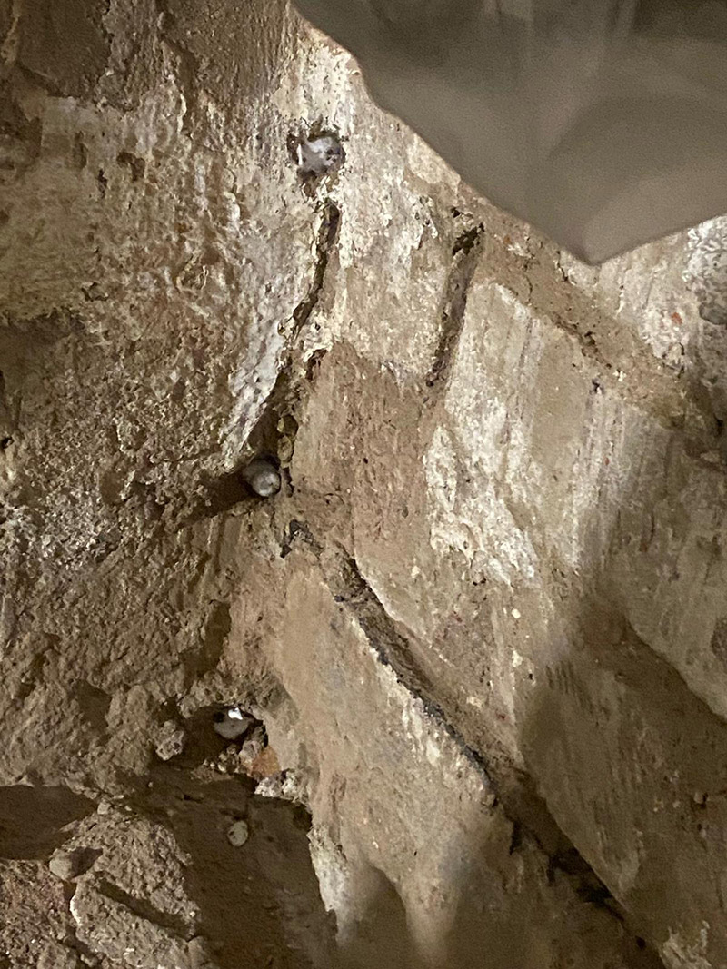 Ein weiterer entscheidender Faktor war die beschädigte beziehungsweise nicht mehr funktionstüchtige Dachpappenbahn, die ursprünglich als Horizontalsperre dienen sollte. Dadurch konnte Feuchtigkeit kapillar über die Fundamente im Erdreich aufsteigen und in das Mauerwerk gelangen.