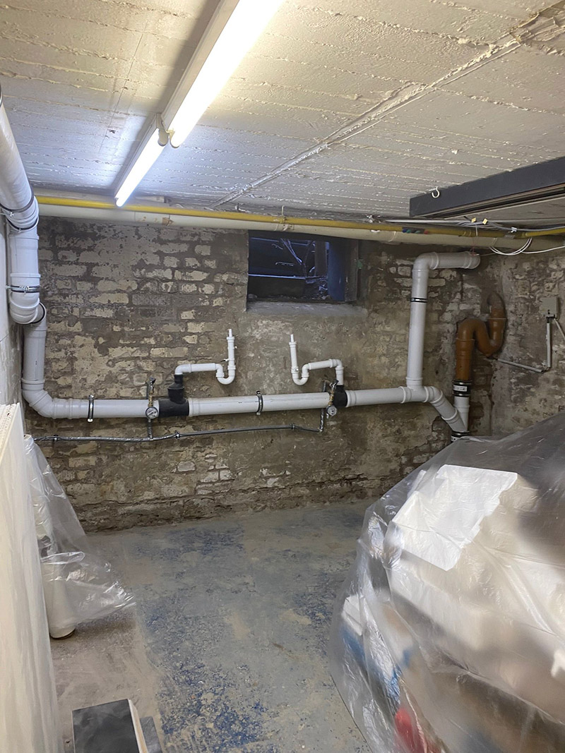 Zur zusätzlichen Sicherung angrenzender Wandbereiche wurden gezielte Vertikalsperren eingebracht. Mittels Injektionsverfahren wurde ein Abdichtungsmittel in das Mauerwerk injiziert, um seitliche Feuchtewanderungen dauerhaft zu unterbinden.