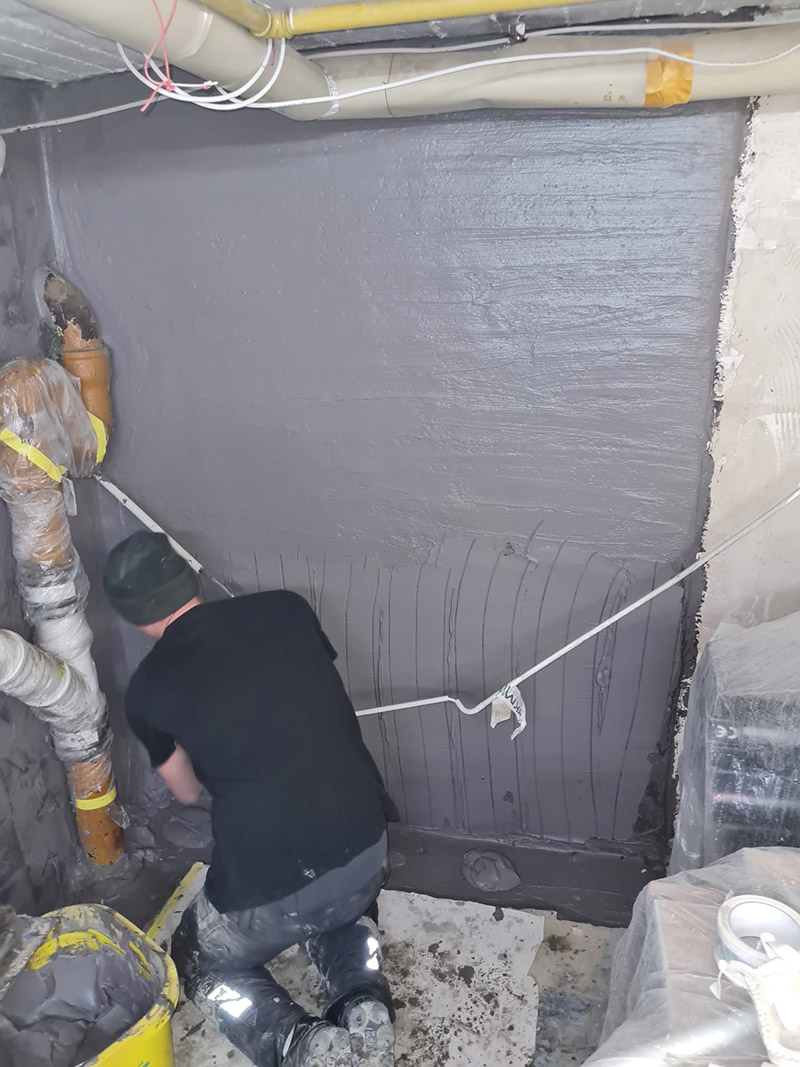 Im Anschluss wurde eine rissüberbrückende mineralische Dichtschlämme in mehreren Lagen aufgetragen. Diese bildet eine dauerhaft druckdichte Abdichtung gegen seitlich eindringende Feuchtigkeit sowie gegen Feuchtigkeit aus dem Bodenbereich.