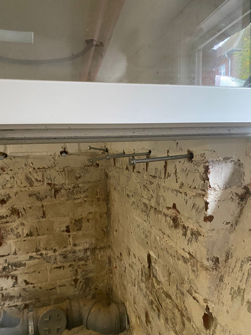 Zusätzliche Injektionen zur Absicherung angrenzender Wandbereiche gegen seitliche Feuchtewanderung.