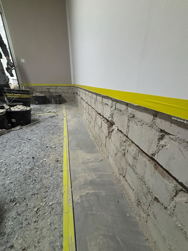 BKM-Innenabdichtung (druckdicht): Mehrlagiger Auftrag einer rissüberbrückenden, mineralischen Dichtschlämme im Wand- und Bodenanschlussbereich zum Schutz vor seitlich eindringender Feuchtigkeit.