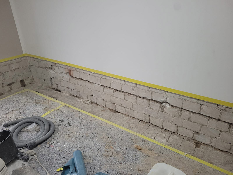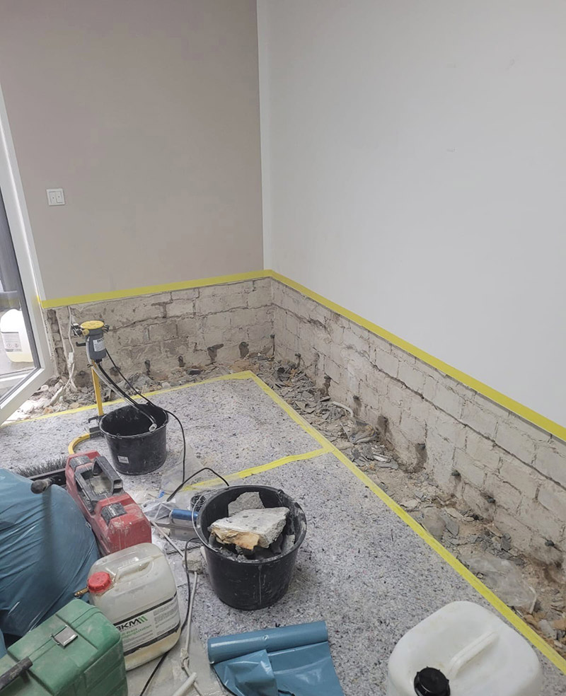 Untergrundvorbereitung: Entfernung des geschädigten Putzes und der kontaminierten Bereiche. Reinigung und Vorbereitung der Wandflächen für die Abdichtung.